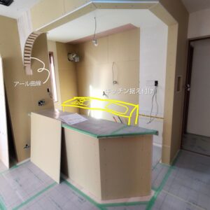 カウンター上の下がり壁をアール曲線形にしていきます。