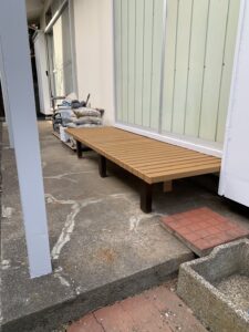 写真のぬれ縁は、脚や骨組みはアルミ製、スノコ床は樹脂製です。